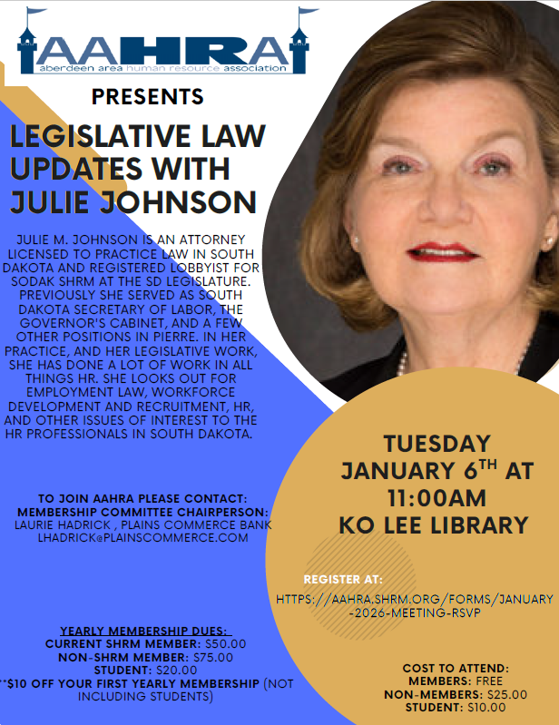 The Aberdeen Area Human Resource Association exists to advance and support the Human Resource and related professions for Aberdeen and surrounding communities.